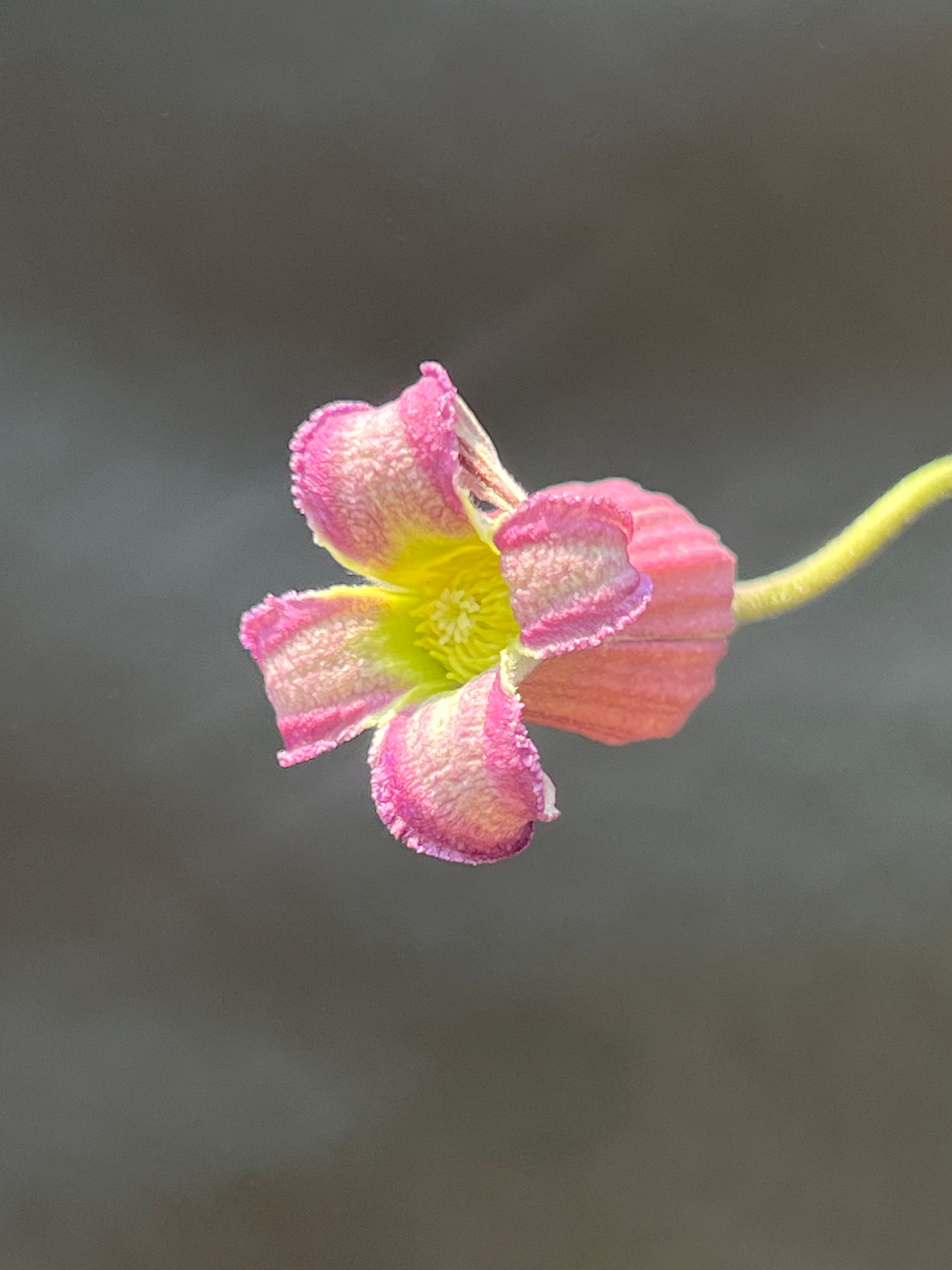 Pitcheriiの交配個体です。花は大輪で存在感があります。花は 外側がbright purpleで、内側がpurple /bright purpleのbicolorです。力強い色合いの花です。