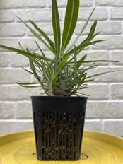 Pachypodium cactipesuは、矮性低木でマダガスカルの最南東部に自生し、標高900mの岩場に自生します。高さ40cm程度で細くてねじれた枝を密に出します。葉は細くロゼット状に展開し、野趣溢れる姿を呈します。トランペットの形をした花は黄色で、長い茎の先端に咲きます。USDAゾーン10以上の乾燥した熱帯に適しますが、10℃程度までは耐えます。