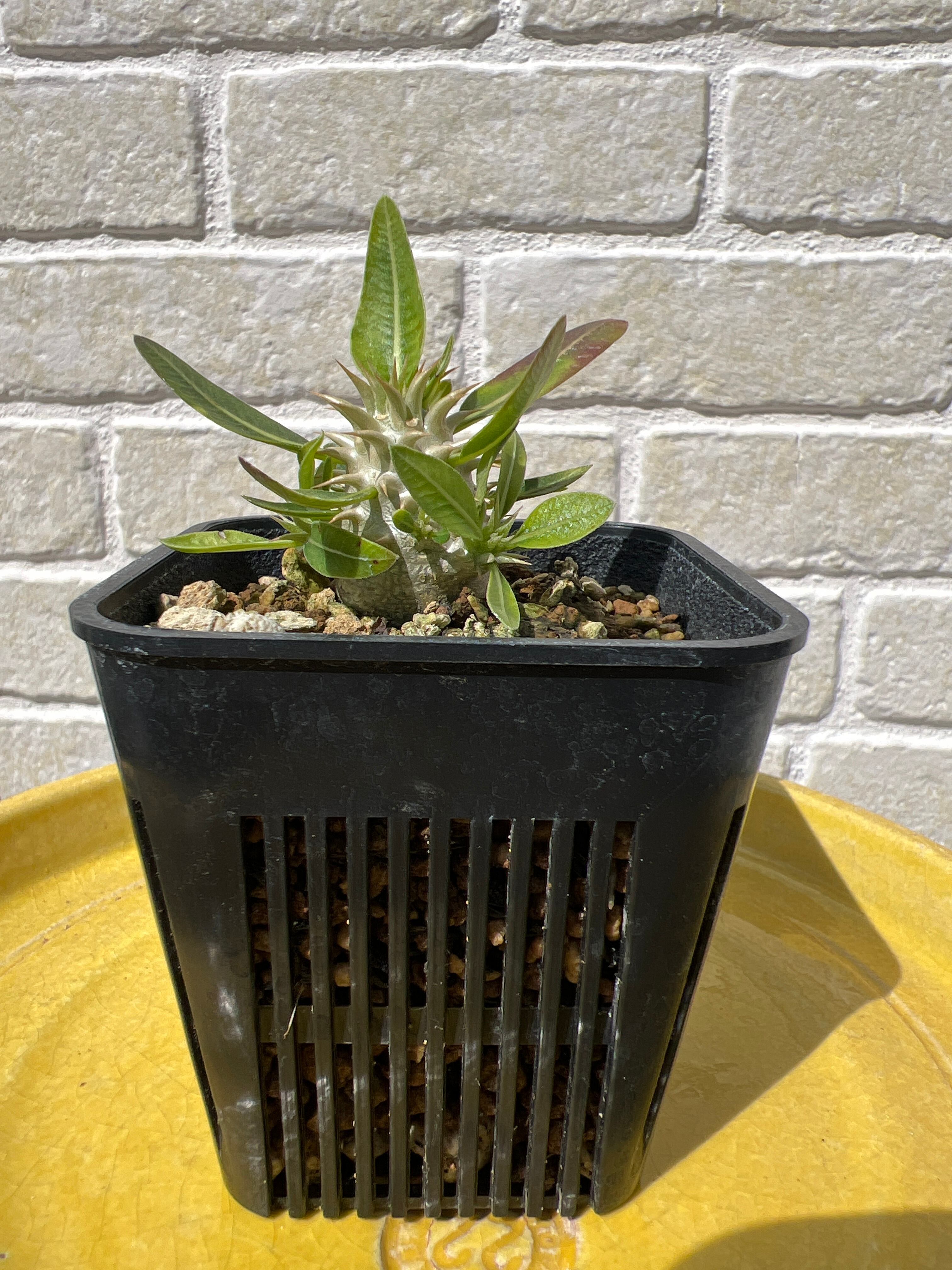 この植物は、乾燥した環境に適していますが、明るい日差しを確保することが育成のカギとなります。水はけの良い土を使用し、赤玉土やパーライトを適切に配合した土壌で育てましょう。特に冬場は休眠期に入るため、水やりは控えめにして、土が完全に乾いたタイミングで行うのが理想です。成長期には、薄めの液肥を月に1~2回施すと健やかな成長が促されます。本個体は実生のため、成長には時間がかかることがありますが、育てる楽しみを存分に感じながら、一緒に成長していく喜びを味わっていただけます。
