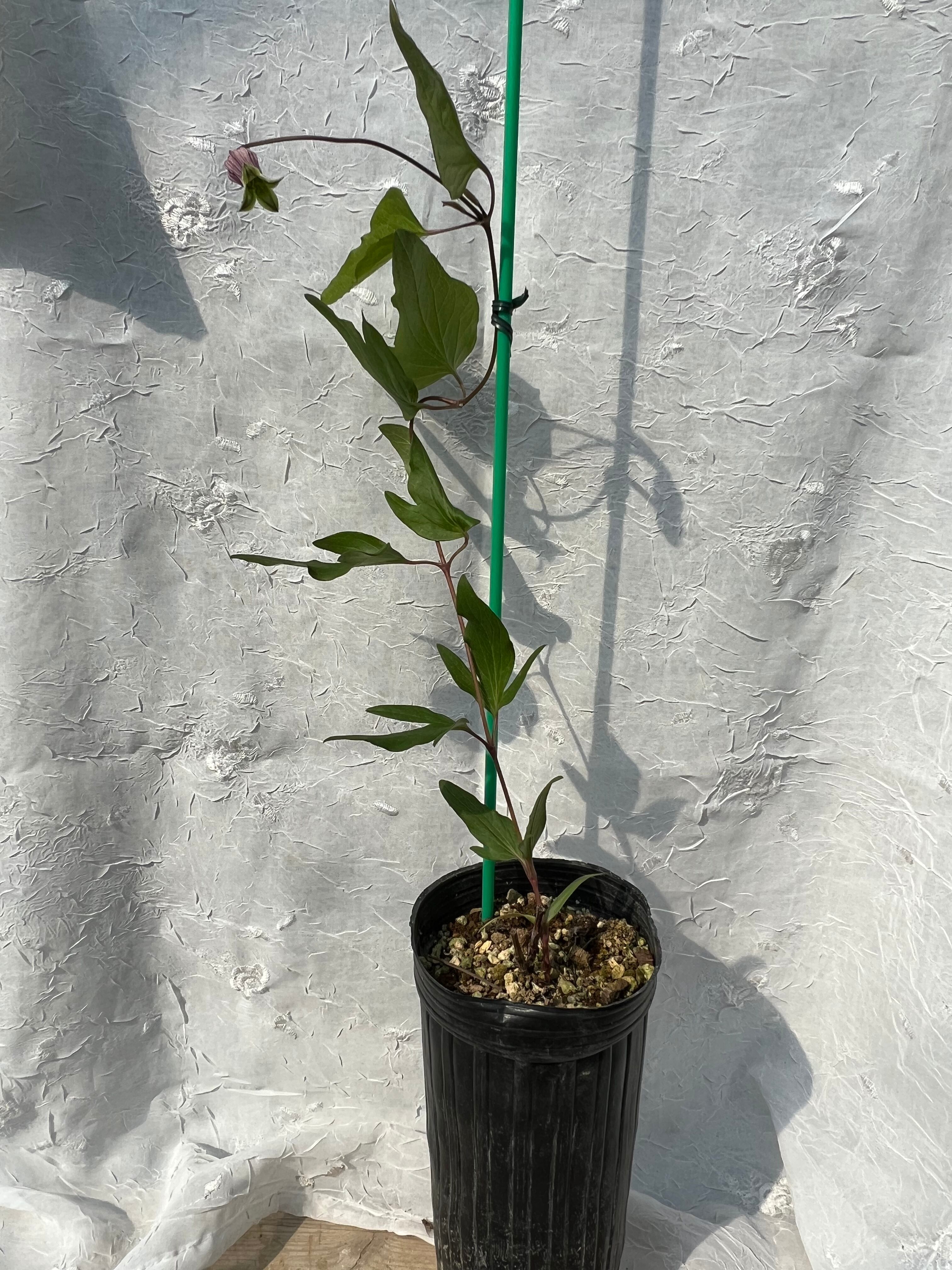 Viorna系の交配個体です。花は(3.0cm X2cm)長めの中粒です。花はlight purpleの個体で内側が面白いグリーンです。渋い花です。