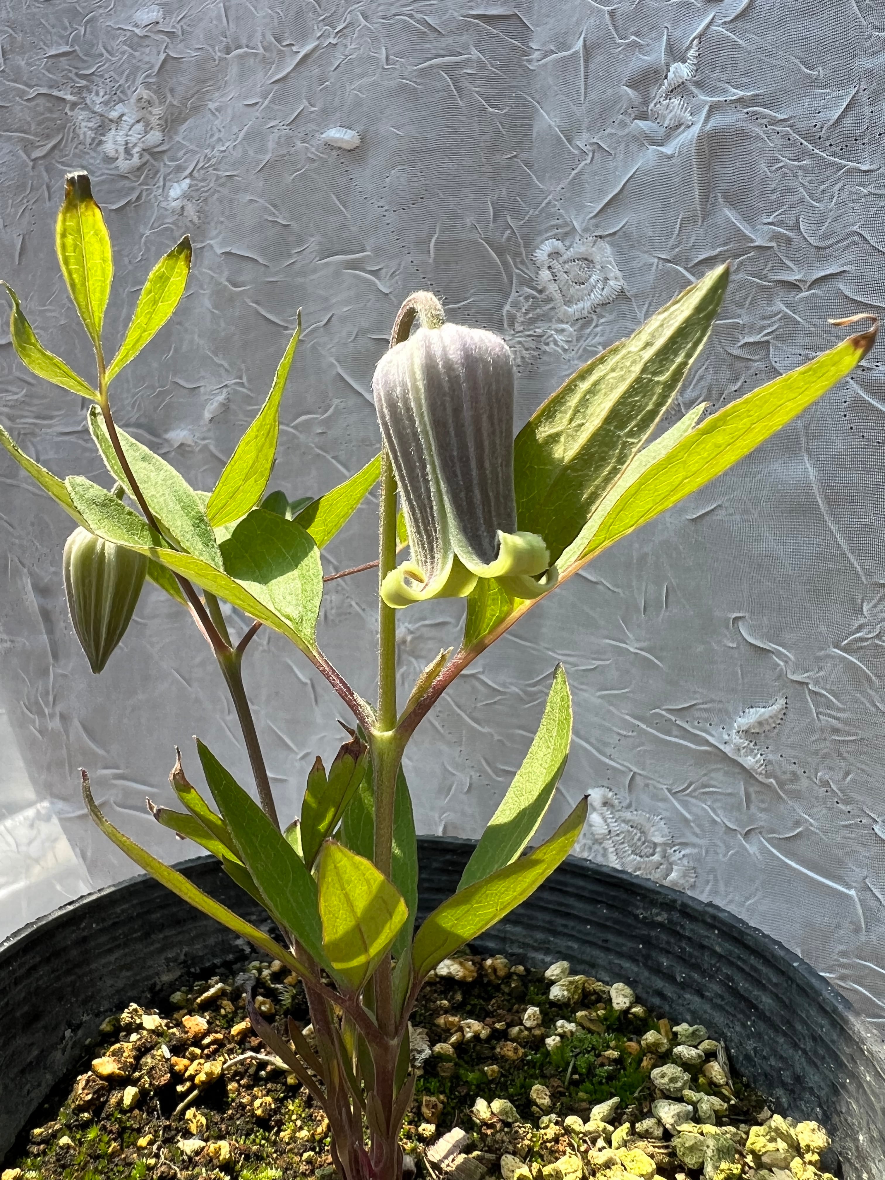 Viorna 系の交配個体です。花は(3.0cm X2cm)中粒です。花はpale purpleとgreenの個体です。もう一作すれば、一回り大きな花になると思います。