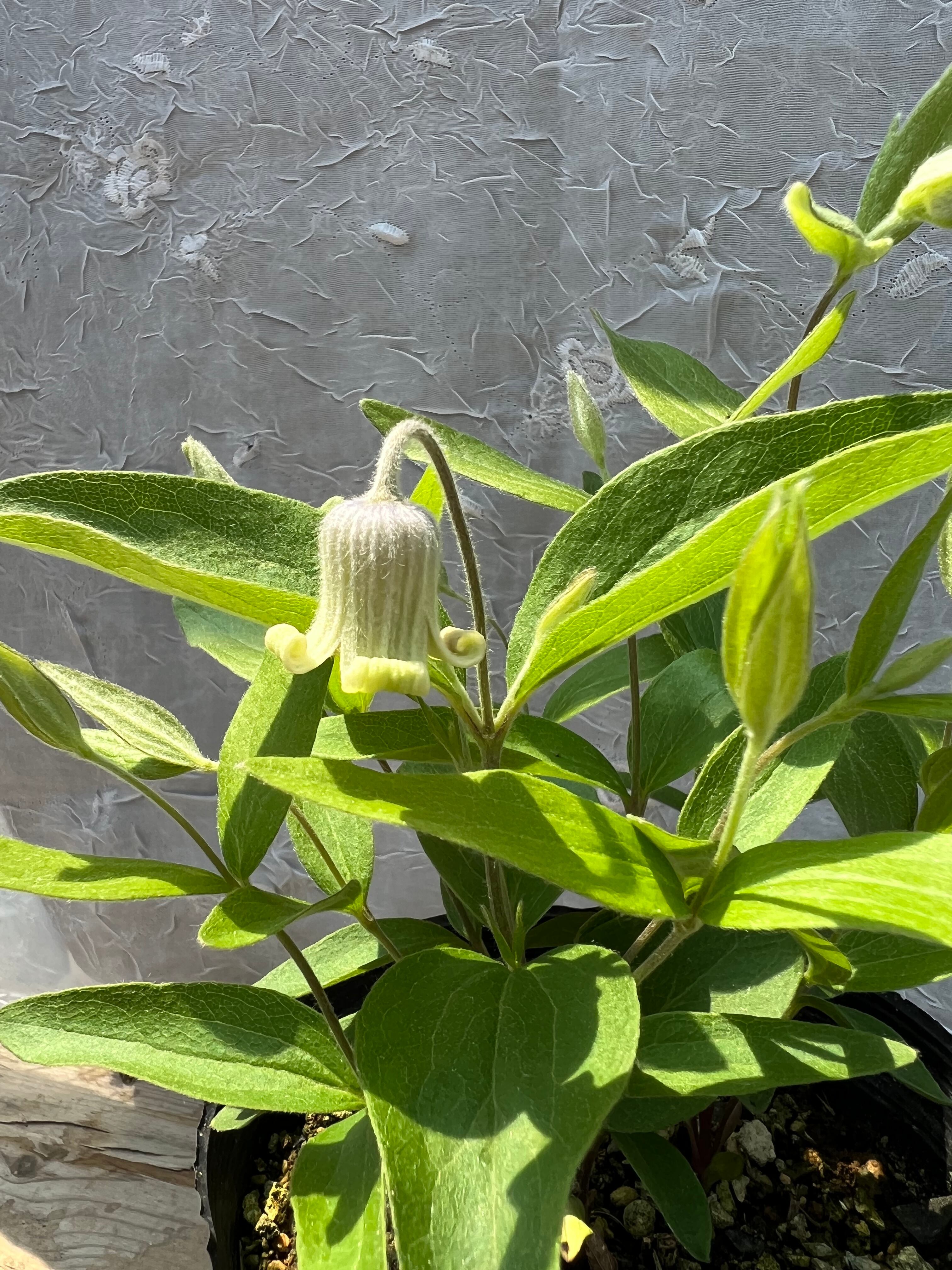 北米大陸東部South Virginiaに自生する木立性(6〜12節)の希少なクレマチス です。C.albicoma(アルビコマ)と分布が重複しますが、albicoma に比べて顎(花弁)が19-34mmとやや長く、花色は、温暖な環境ではwhite〜green、寒冷地ではpale purpleに変化する様です。芽出しの葉はベルベットの様な繊毛に覆われています。本個体は花のShapeもよくホワイトグリーン基調の中輪個体です。耐寒性・耐暑性が広く、-10〜35℃です。本個体は米国から純粋な種子を輸入し、実生で栽培したものです(クローンはありません)。4号ロングポットです。春の花が終わるまではポットのまま管理していただき、それ以降様根の様子を見てポットサイズを大きくする事をご検討ください。