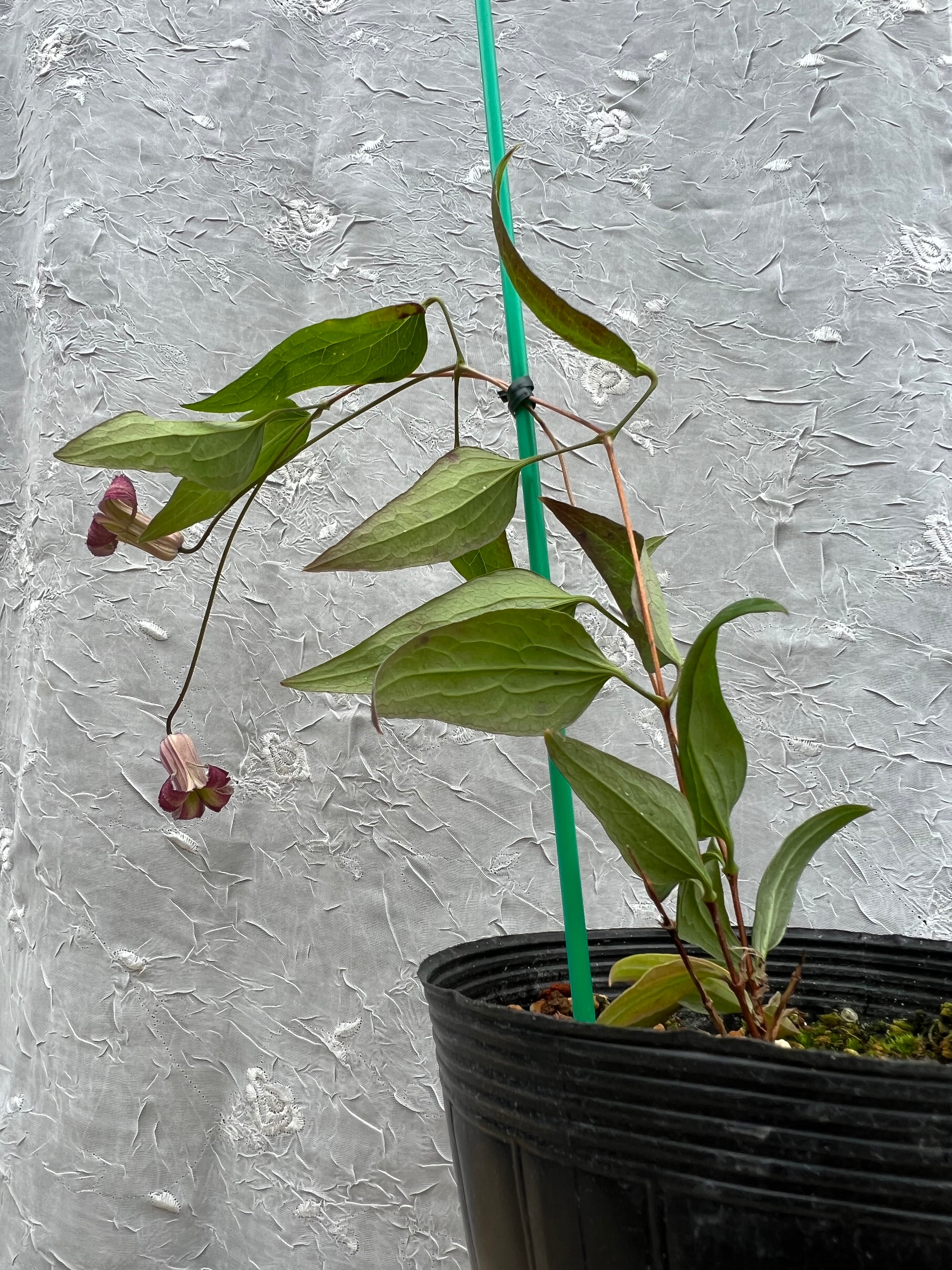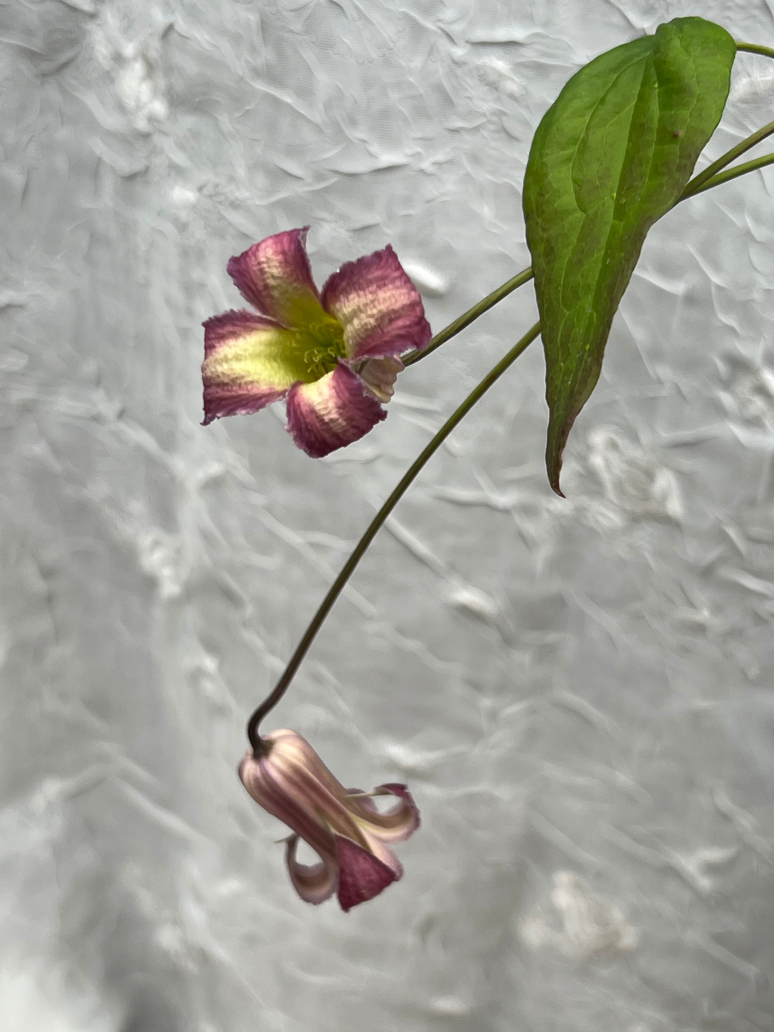 Crispa系の交配個体です。花は(3.5cm X2.5cm)大粒です。花は内側がbicolor で外側の薄いgreenish purple と落ち着いた美しい個体です。今年は35cmほどのステムに花が付いており、蔓が伸びない個体であれば、面白いと思います。