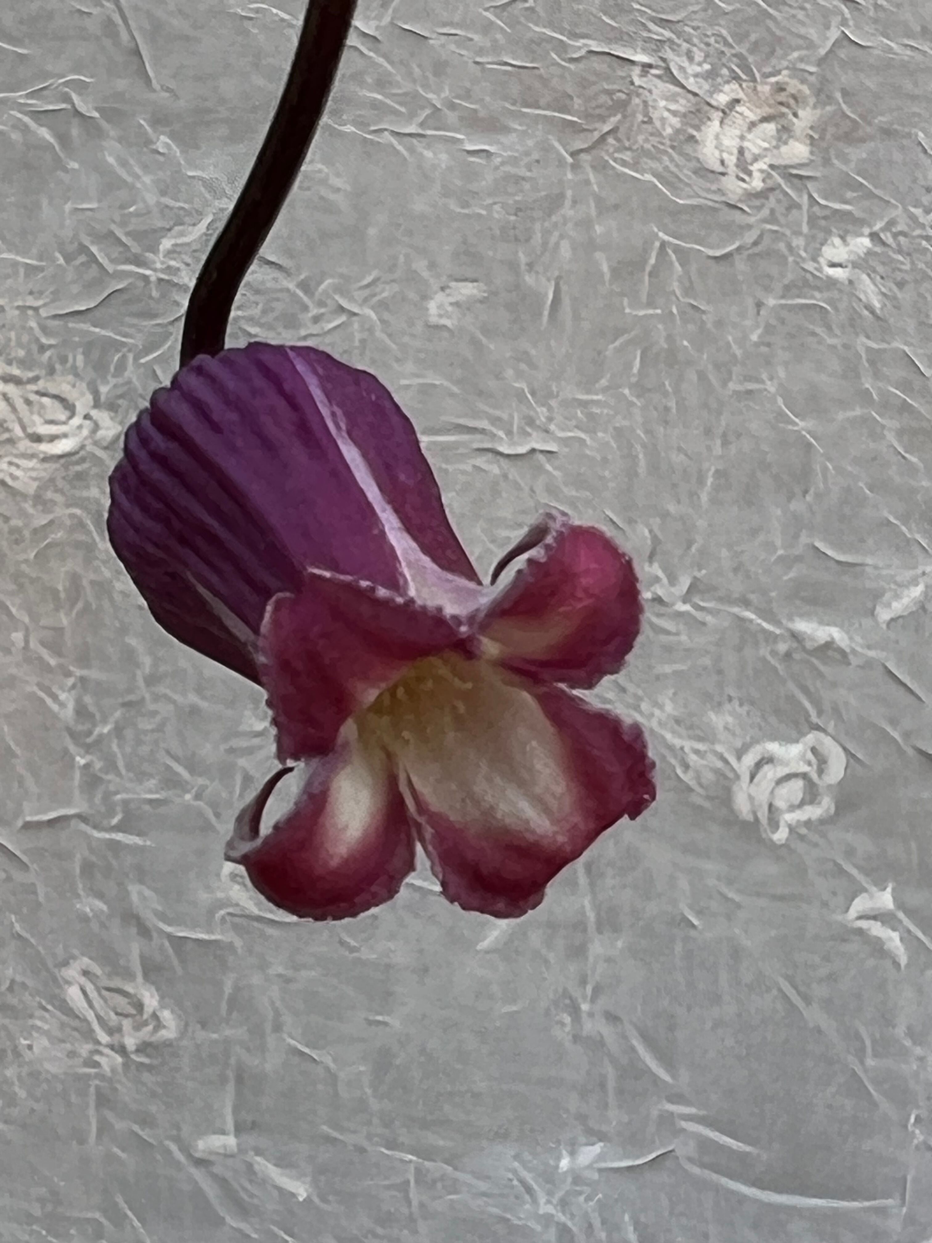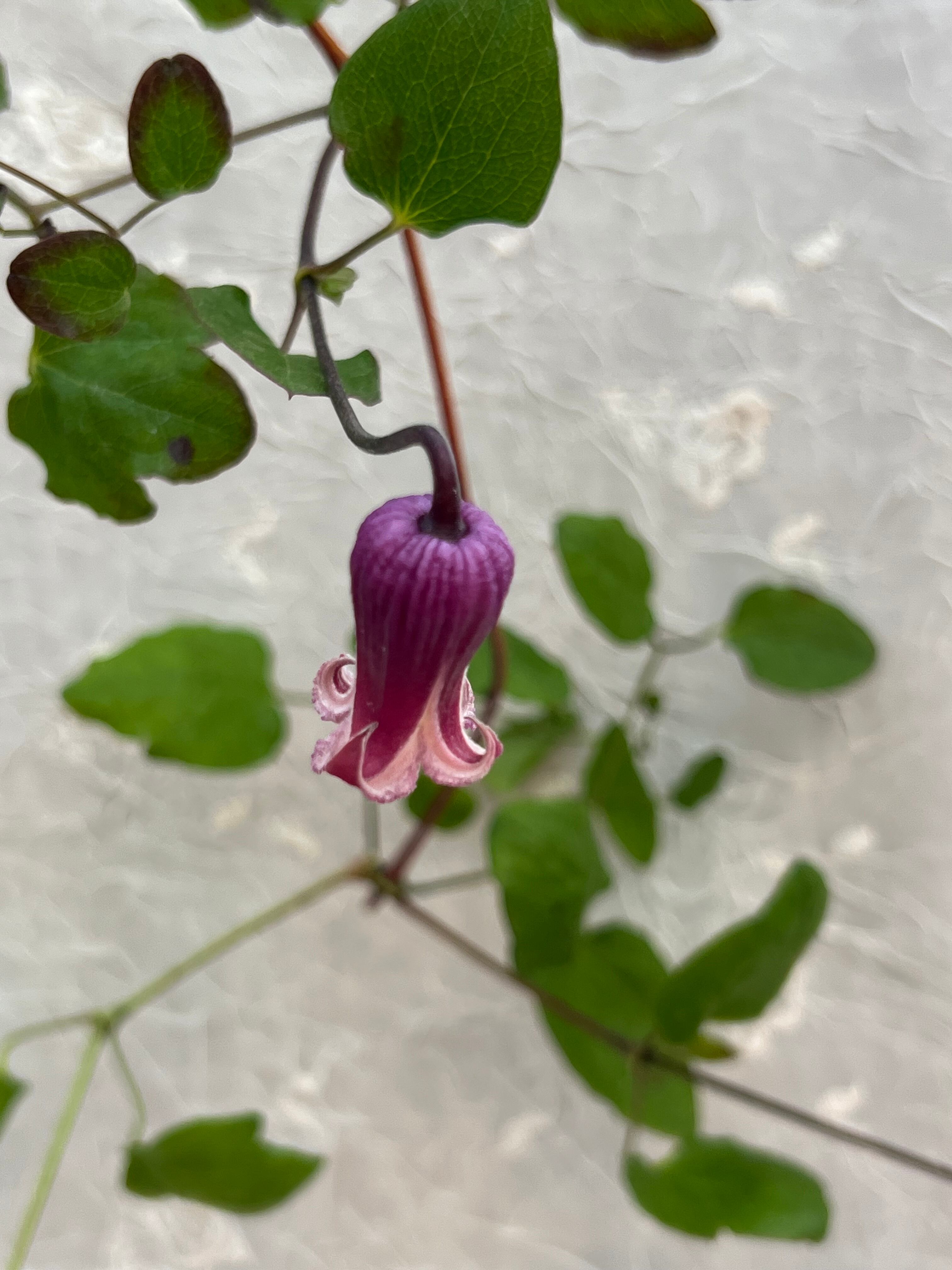 特徴 :ネブラスカ州東部からインディアナ州西部及びテキサス州の一部に分布します。Viorna系の中では極めて特徴的なクレマチスの原種です。繁殖が実生に限られ、開花までに最短でも3年以上必要とするため、生産量が少なく、更に純粋な種を入手することが難しいため、交雑していない本種を入手するルートは極めて限られています。花型、色共に、極めて魅力的なクレマチスです。蔓は3-4mまで伸びますので一般的には蔓バラやバーゴラに這わせます。この個体は外側がpurpleで内側がpurple 底白です。写真は5/3に撮影したものです。4号ロングポットです。