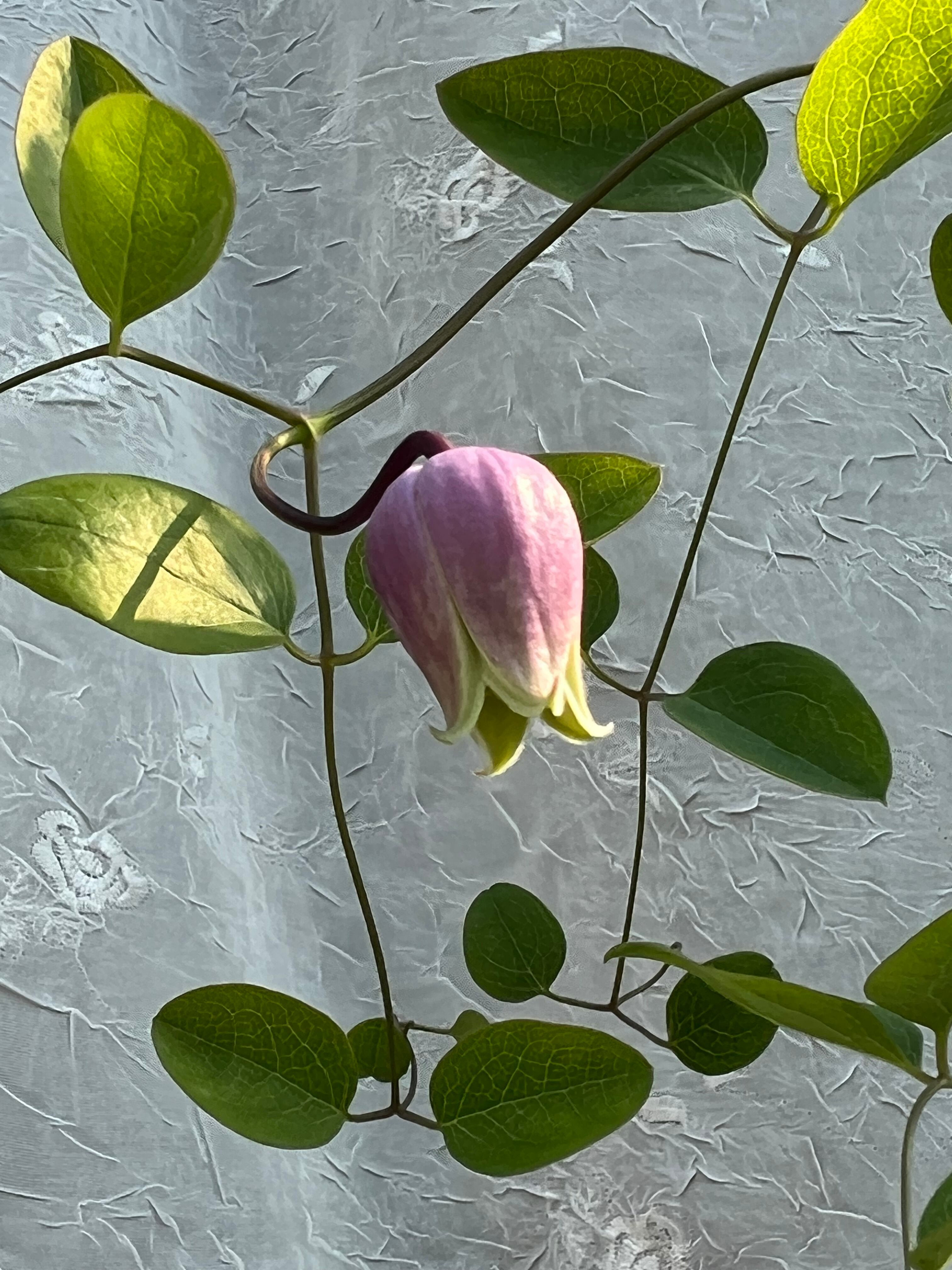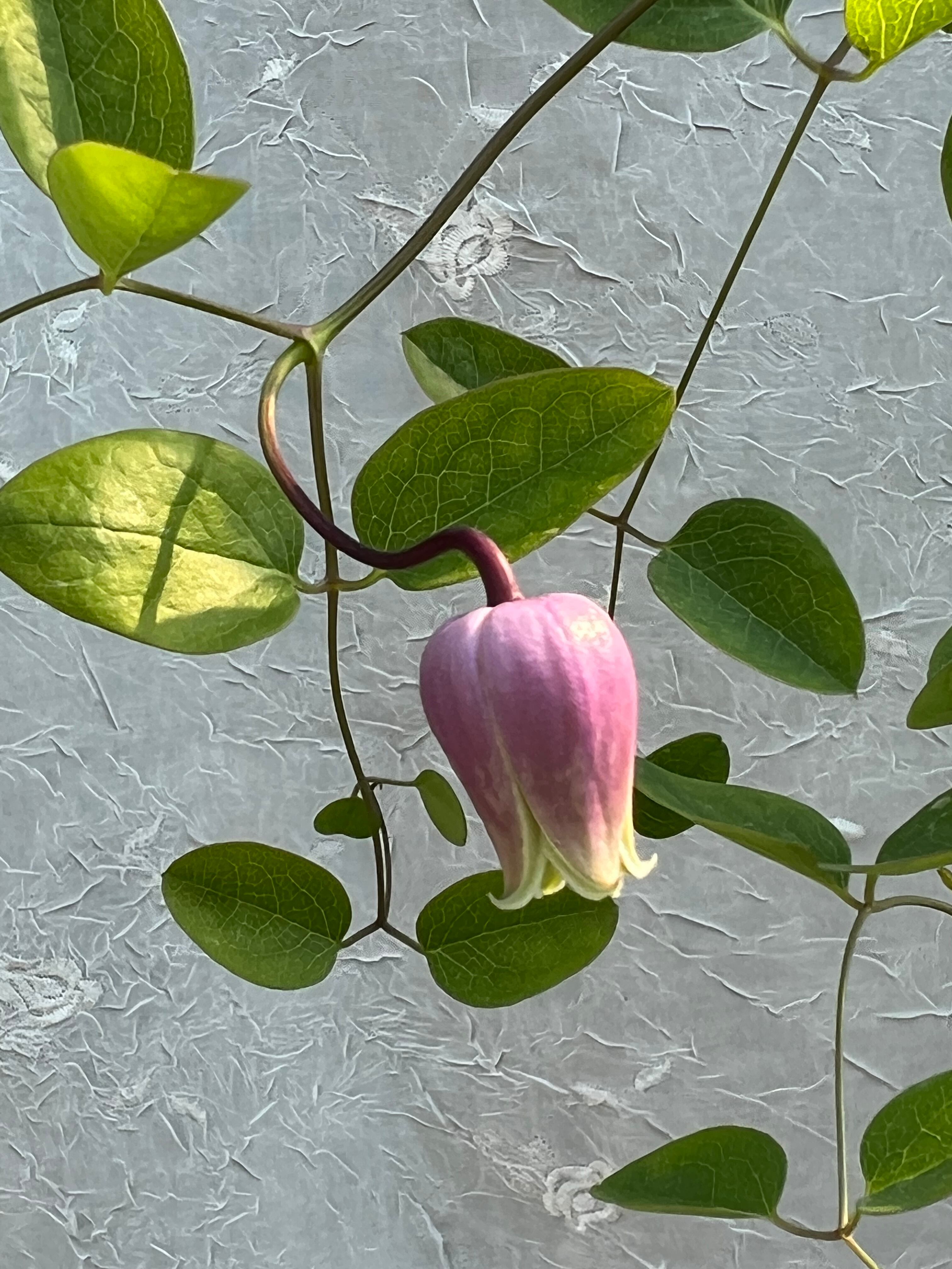 北米大陸東部South Virginia, North Georgia, North West North Carolinaに自生する木立性(ステムは細い)の希少なクレマチス です。葉は比較的大きなオーバル型で独特の形をしており、表面は白っぽく粉がふいたような艶消しになります。花はステムの先端もしくは2節目に咲き、顎(花弁)が10-25mmとコンパクトです。花色は宝石のような奥深い色です。花型もバランス良いプロポーションだと思います。花に小さな虫食い跡があります。耐寒性・耐暑性が広く、-10〜35℃です。本個体は米国から純粋な種子を輸入し、実生で栽培したものです(クローンはありません)。15cmロングポットです。