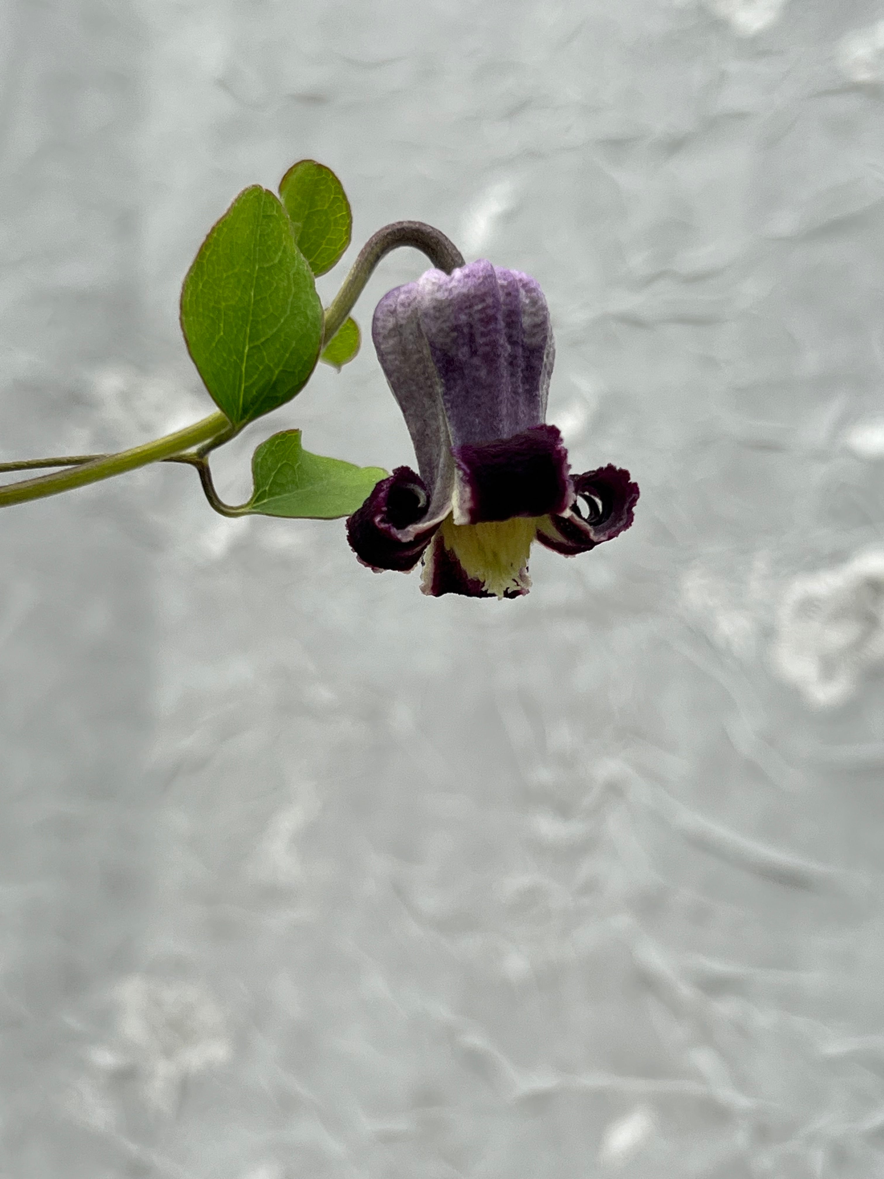 特徴 :ネブラスカ州東部からインディアナ州西部及びテキサス州の一部に分布します。Viorna系の中では極めて特徴的なクレマチスの原種です。繁殖が実生に限られ、開花までに最短でも3年以上必要とするため、生産量が少なく、更に純粋な種を入手することが難しいため、交雑していない本種を入手するルートは極めて限られています。花型、色共に、極めて魅力的なクレマチスです。蔓は3-4mまで伸びますので一般的には蔓バラやバーゴラに這わせます。この個体は内側がpurple の濃色個体です。このタイプは来年あたり花が大きくなり太くなります。写真は5/23に撮影したものです。大分咲き進んでありますので、発送時には花が落ちている可能性がありますのでご承知おき下さい。9cmスーパーロングポットです。