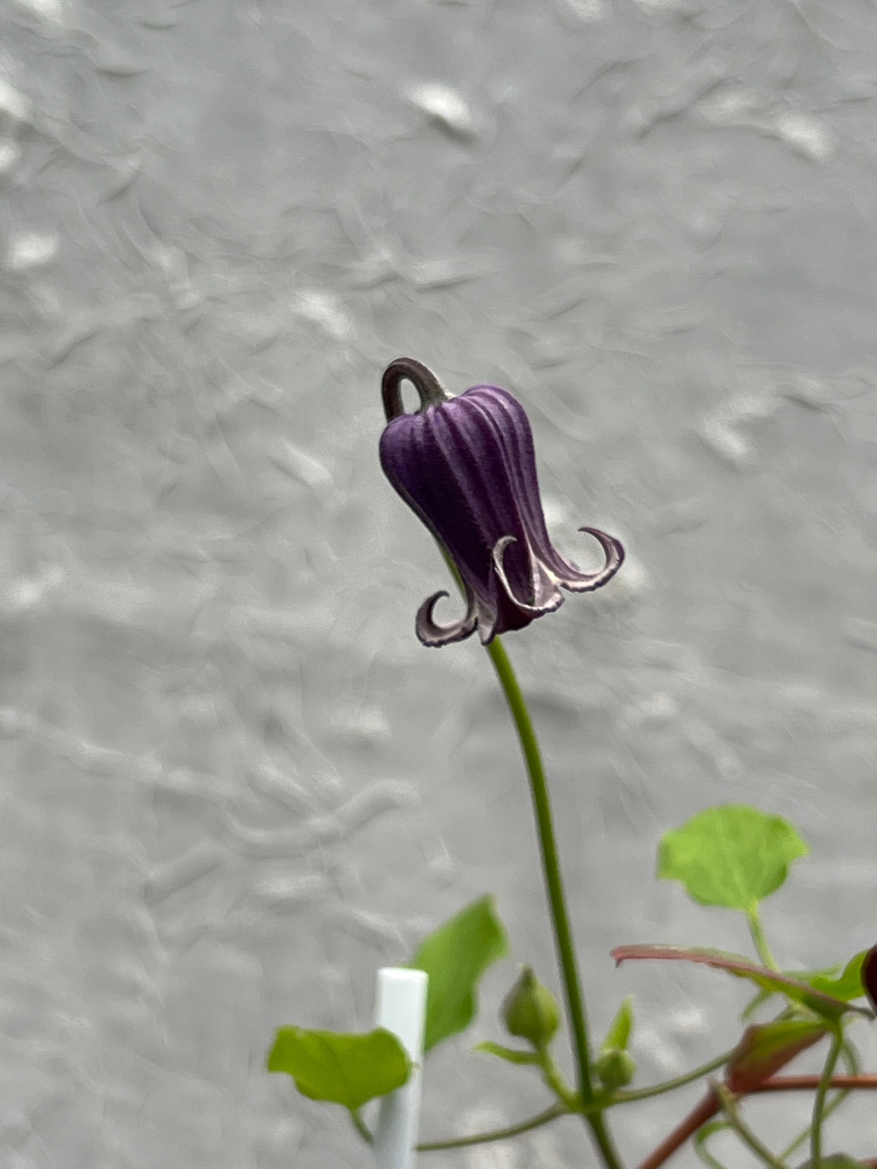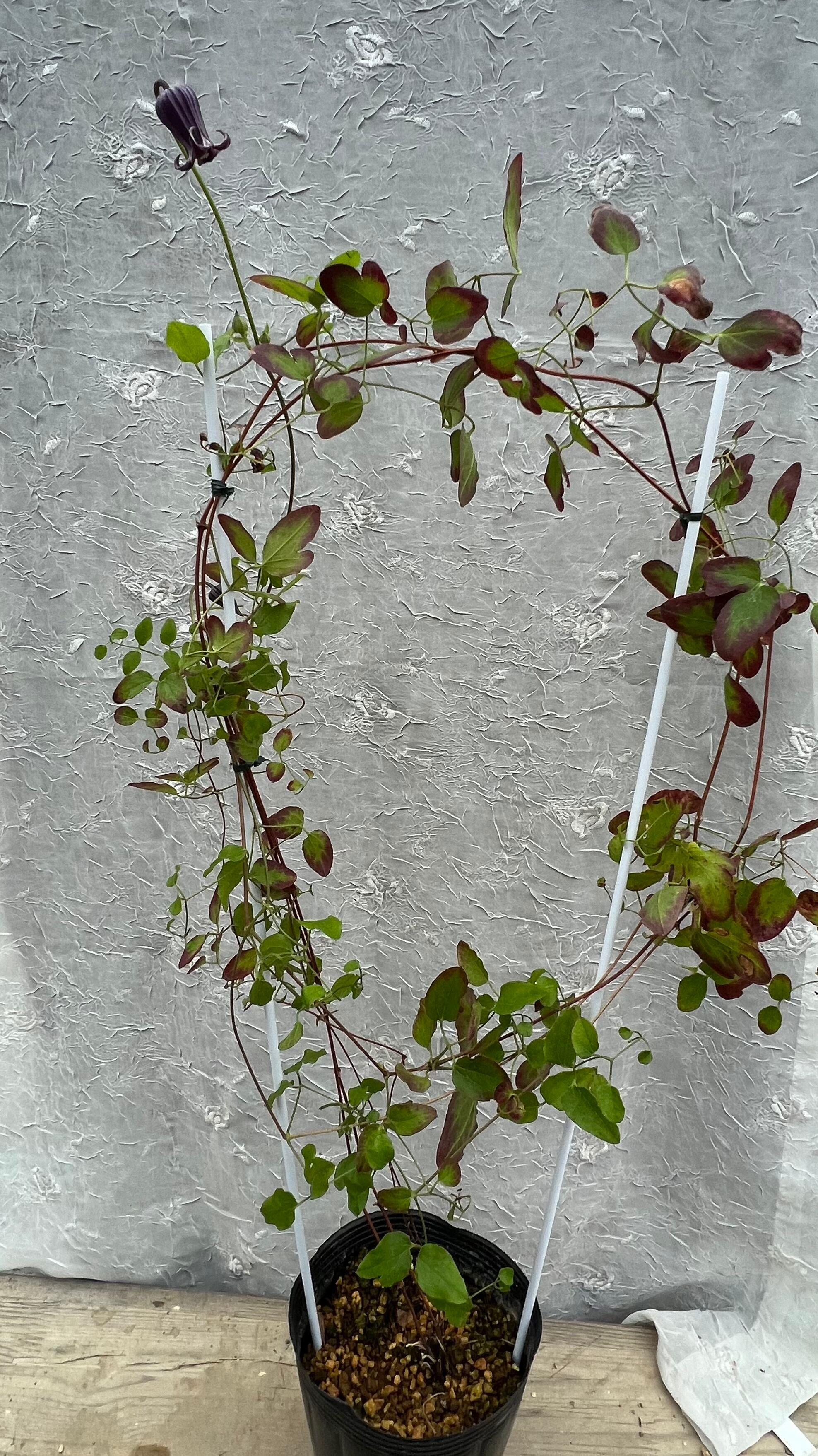 特徴 :ネブラスカ州東部からインディアナ州西部及びテキサス州の一部に分布します。Viorna系の中では極めて特徴的なクレマチスの原種です。繁殖が実生に限られ、開花までに最短でも3年以上必要とするため、生産量が少なく、更に純粋な種を入手することが難しいため、交雑していない本種を入手するルートは極めて限られています。花型、色共に、極めて魅力的なクレマチスです。蔓は3-4mまで伸びますので一般的には蔓バラやバーゴラに這わせます。この個体はpurple の濃色個体です。ステムは2本です。このタイプは来年あたり花が大きくなり太くなります。写真は6/2に撮影したものです。4号ロングポットです。
