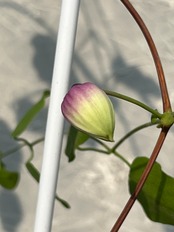 特徴 :テキセンシスと同様にネブラスカ州東部からインディアナ州西部及びテキサス州の一部に分布します。他のViornaの様に葉に鋸歯が見られないのが特徴です。ラベンダー色のボディーに先端がグリーンにに変化するのが特徴的なクレマチスの原種です。繁殖が実生に限られ、開花までに最短でも3年以上必要とするため、生産量が少なく、更に純粋な種を入手することが難しいため、交雑していない本種を入手するルートは極めて限られています。花型、色共に、極めて魅力的なクレマチスです。蔓は2-3mまで伸びますので一般的には蔓バラやバーゴラに這わせます。この個体は典型的な色と形態を呈しています。高温期のため、花はすぐに咲き進みます。多少葉に傷みがあります。発送に際して植物の性質上、花が落ちたり、希に蔓が折れる事もあります。この点をご了承の上ご購入のご判断をいただければ幸いです。